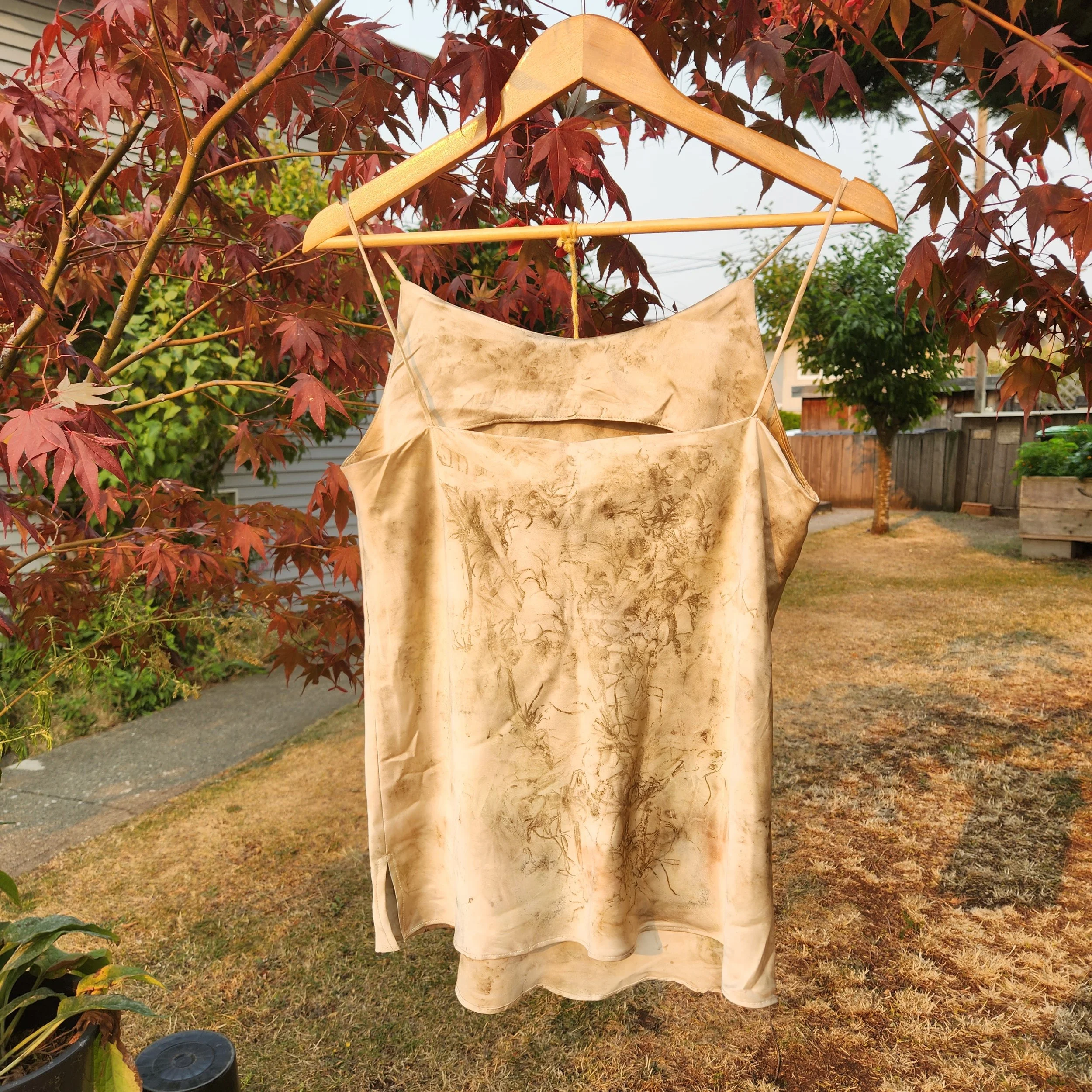 50/50 Silk/Polyester strappy tank top eco-printed with coreopsis, scabiosa, and cosmos.